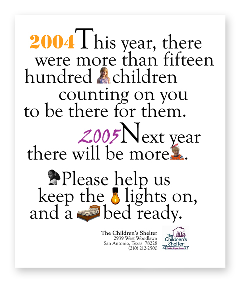 Ad designed as a comp for The Children's Shelter in San Antonio, Texas RESEARCH & CONCEPT | DESIGN | FULL PRODUCTION | MEDIA PLACEMENT Call someone with a track record of producing powerful design, imaging and messages. Imaging solutions for the Corporate & Publishing Environment. |