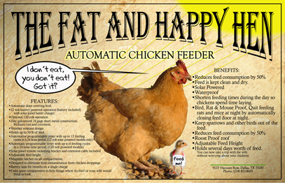Packaging label and display for The Fat and Happy Hen Automatic Chicken Feeder. RESEARCH & CONCEPT | DESIGN | FULL PRODUCTION | MEDIA PLACEMENT Call someone with a track record of producing powerful design, imaging and messages. Imaging solutions for the Corporate & Publishing Environment. |